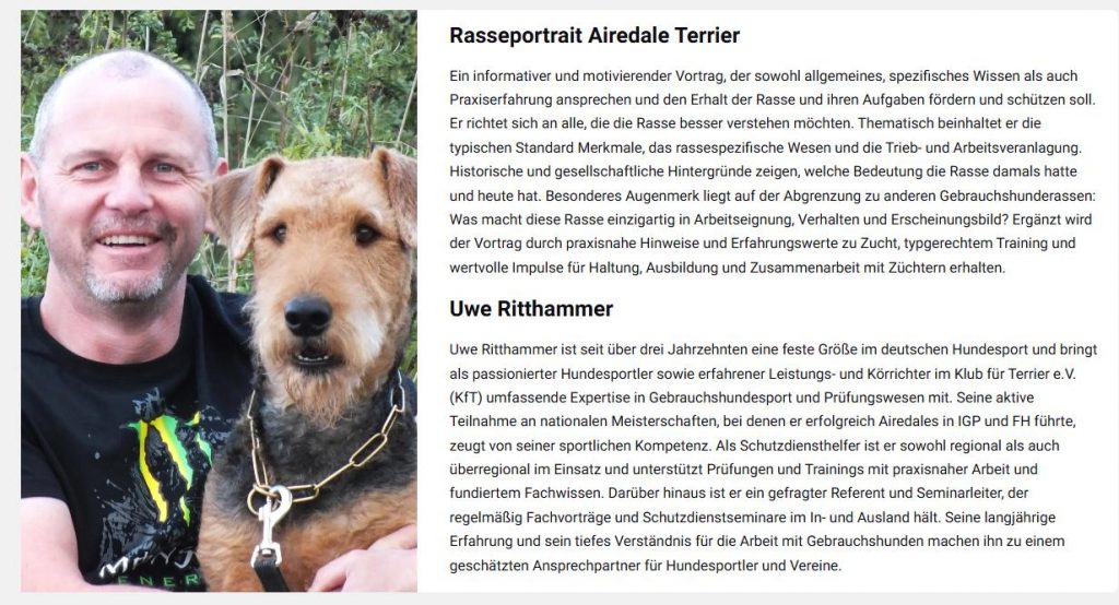 Auch der Airedale wird als Gebrauchshunderasse vorgestellt werden. Termin ist der Donnerstag, 19.03.2026 um 15 Uhr. Der Vortrag ist kostenlos.