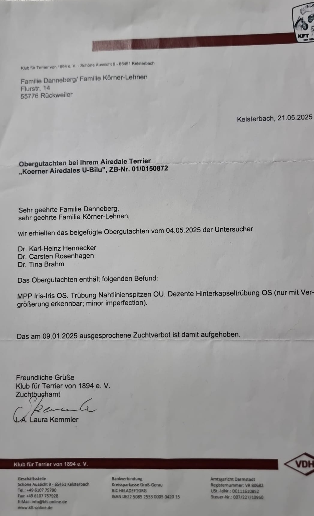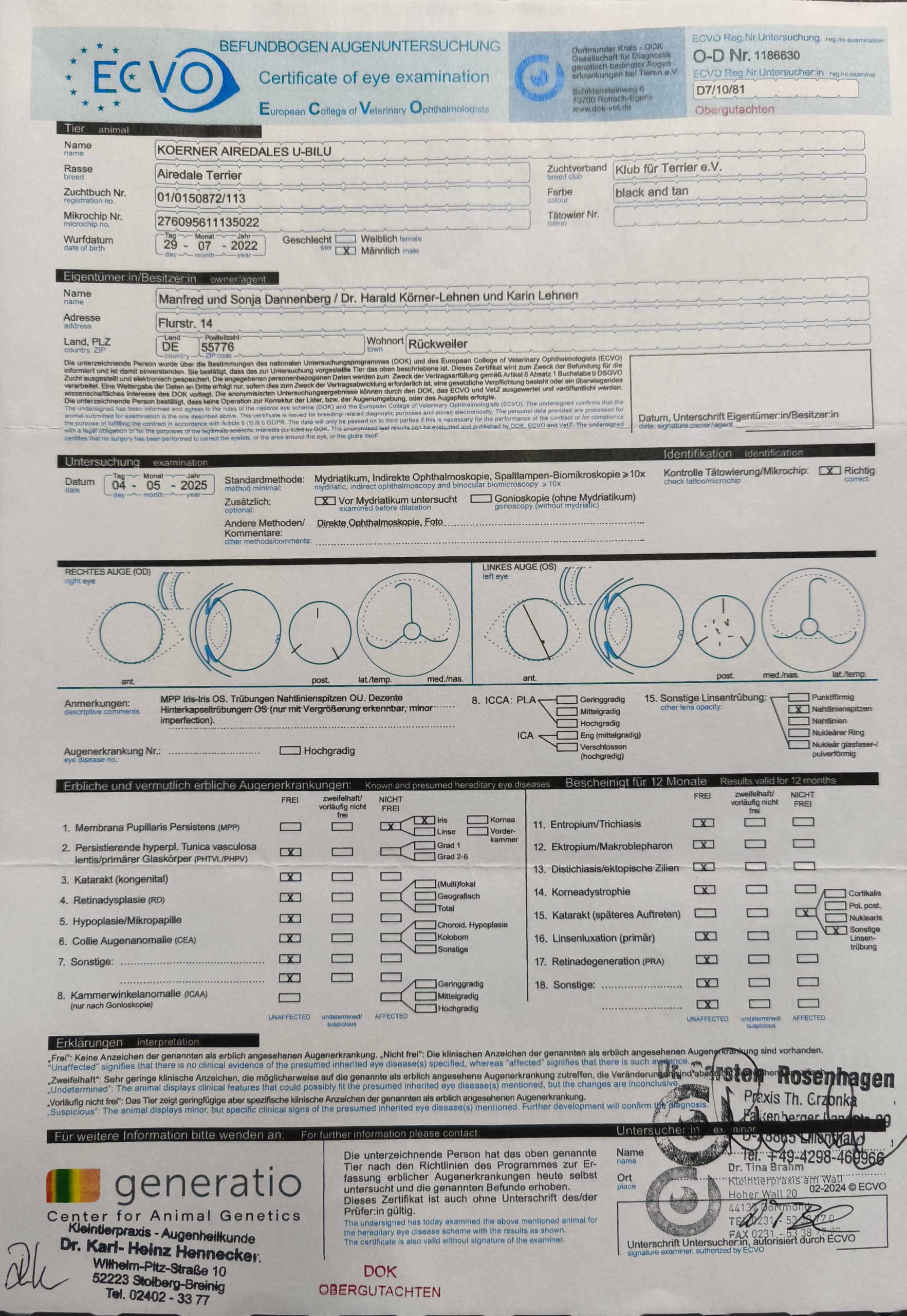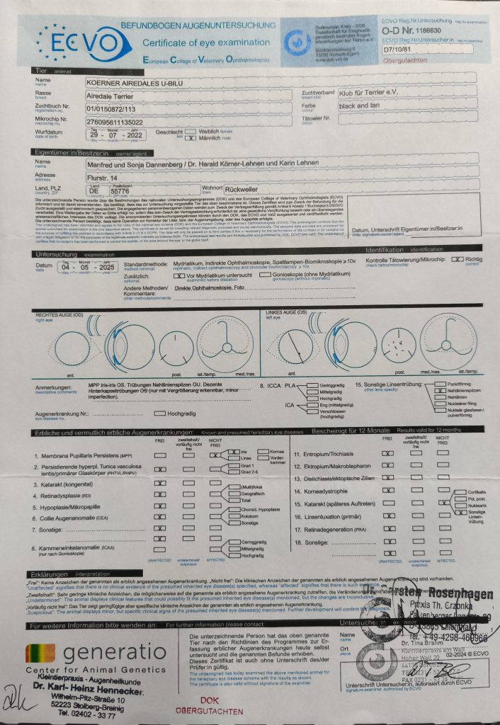 Duke Black & Tan, HD-A2, ED-0, PRA-frei, BH/VT, IGBH1, FPr1 | Ch. Dr.'s Unplugged Captain Kirk, HD-B1, ED-0 |
