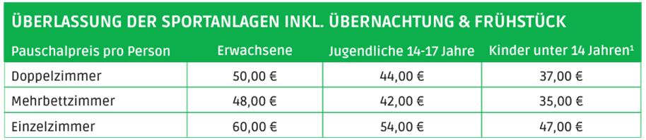 Übernachtungen sind nur ohne Hund möglich! Die Nutzung sämtlicher Sporteinrichtungen, Seminarräume sowie der Schwimmhalle und des Fitnessstudios ist inklusive. Die Nutzungszeiten sind mit dem Team der Landessportschule abzustimmen.