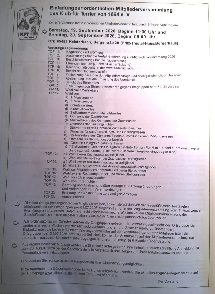 KfT Mitgliederversammlung am 19./20.09.26 Gepostet von ritthammer | Apr. 24, 2026 | Airedale News, Termine | 0