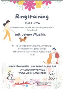 Die Anmeldemöglichkeit und weitere Informationen sind auf unserer Homepage unter https://www.vdh-franken.de/Veranstaltungen/Ringtraining/ zu finden.