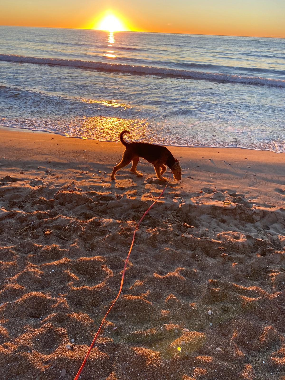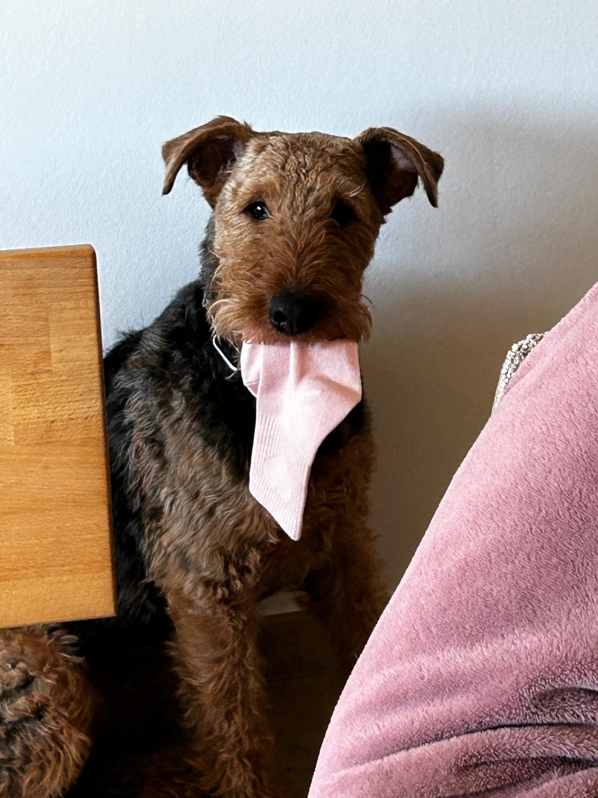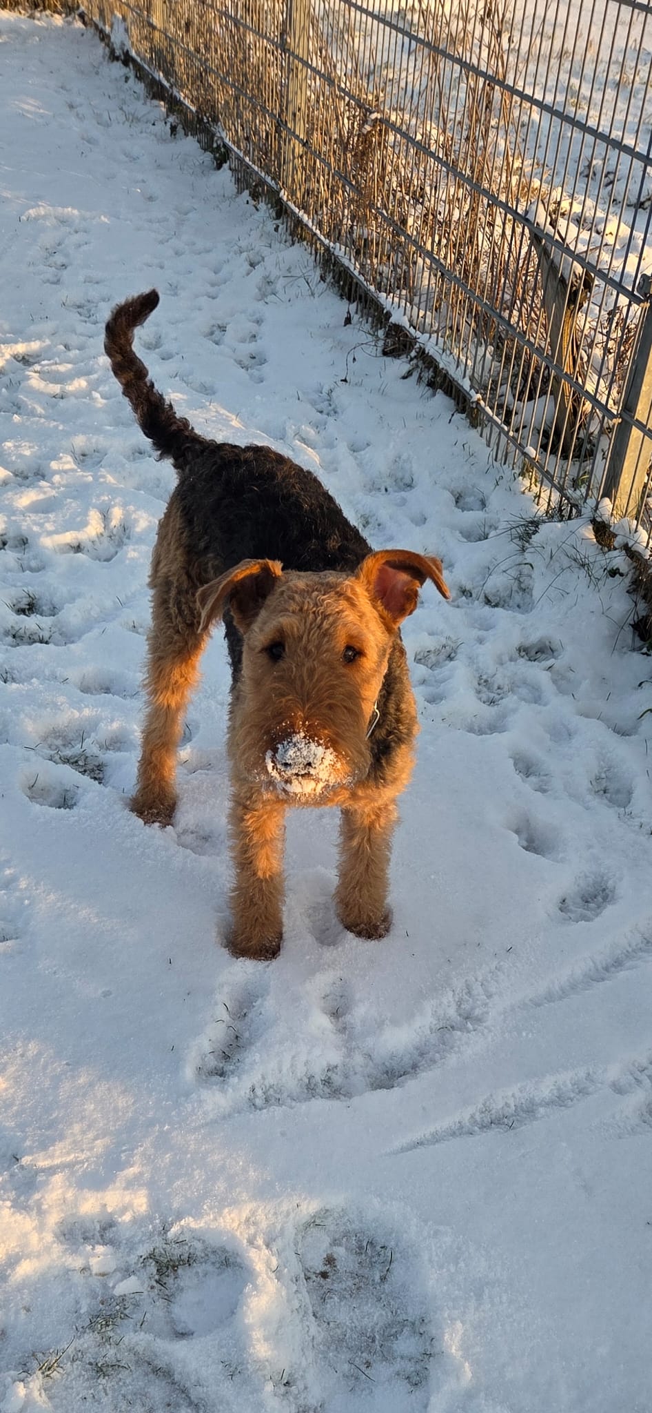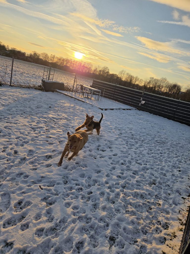 Frieda ist eine sehr sportliche und eigenständige, zwei Jahre alte Airedale Hündin. Sie ist nicht sehr schreckhaft und auch Silvester ist bis jetzt kein Problem. Sie frisst gut und ist über Futter gut zu lenken und zu erziehen. Geboren ist sie im Januar 2024. Frieda ist sehr lernwillig und fährt total auf ihren Dummy und auf Fährtenarbeit ab. Sie kann sehr gut mehrere Stunden alleine bleiben, fährt gut Auto, läuft gut am Fahrrad und schläft auch gut durch. Mit anderen Hunden ist sie gut sozialisiert, sie hat jedoch auch Jagdtrieb und so ist es wichtig, eine gute Bindung aufzubauen und ihr Alternativen zu bieten. Sitz, Platz, Bleib ist noch ausbaufähig, Rückruf klappt in der Regel gut. Selbstverständlich ist sie stubenrein.